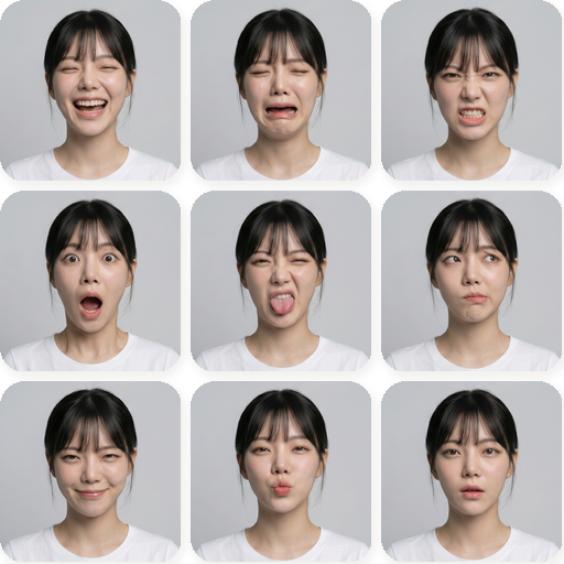 請依據我上傳的這張自拍,產出一張「3×3 九宮格圖」(3 列 × 3 欄,共 9 個正方形小格)。每一格都是同一個人的肖像,但表情完全不同、越誇張越好,像是在演舞台劇。 9 種表情(任選或自己發揮): 1. 放聲大笑(頭微仰、眼睛瞇起、嘴大張露齒) 2. 嚎啕大哭(閉眼、淚水流下、嘴開成方形) 3. 暴怒(咬牙切齒、眉毛下壓、鼻孔張開) 4. 驚嚇(眼睛瞪大、嘴巴張成圓形 O) 5. 噁心(鼻子皺起、舌頭伸出「yuck」) 6. 困惑(一邊眉毛挑高、眼睛斜看、嘴撇一邊) 7. 壞笑(嘴角單邊上揚、眼神斜睨、算計感) 8. 飛吻(嘴唇嘟起、眼神夢幻半閉) 9. 放空(眼神渙散、嘴微張、零情緒) 硬性要求: - 9 格中臉、髮型、衣服、燈光、背景都要一致(誇張的只能是表情)。 - 輸出是「一張完整的 1:1 正方形九宮格圖」,格子之間沒有邊框、沒有文字、沒有數字。 - 表情要誇張戲劇化,不要含蓄,小圖也能一眼分辨。